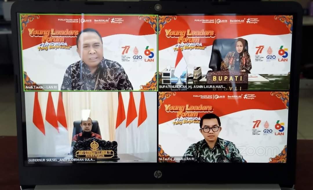 Kepala LAN RI Adi Suryanto, yang diwakili M. Taufiq sebagai Deputi LAN RI, menyampaikan ucapan terimakasih kepada Puslatbang KMP LAN Makassar dengan diselenggarakannya kegiatan ini bisa berkumpul bersama melalui virtual para pemimpin muda yang menginspirasi bangsa.