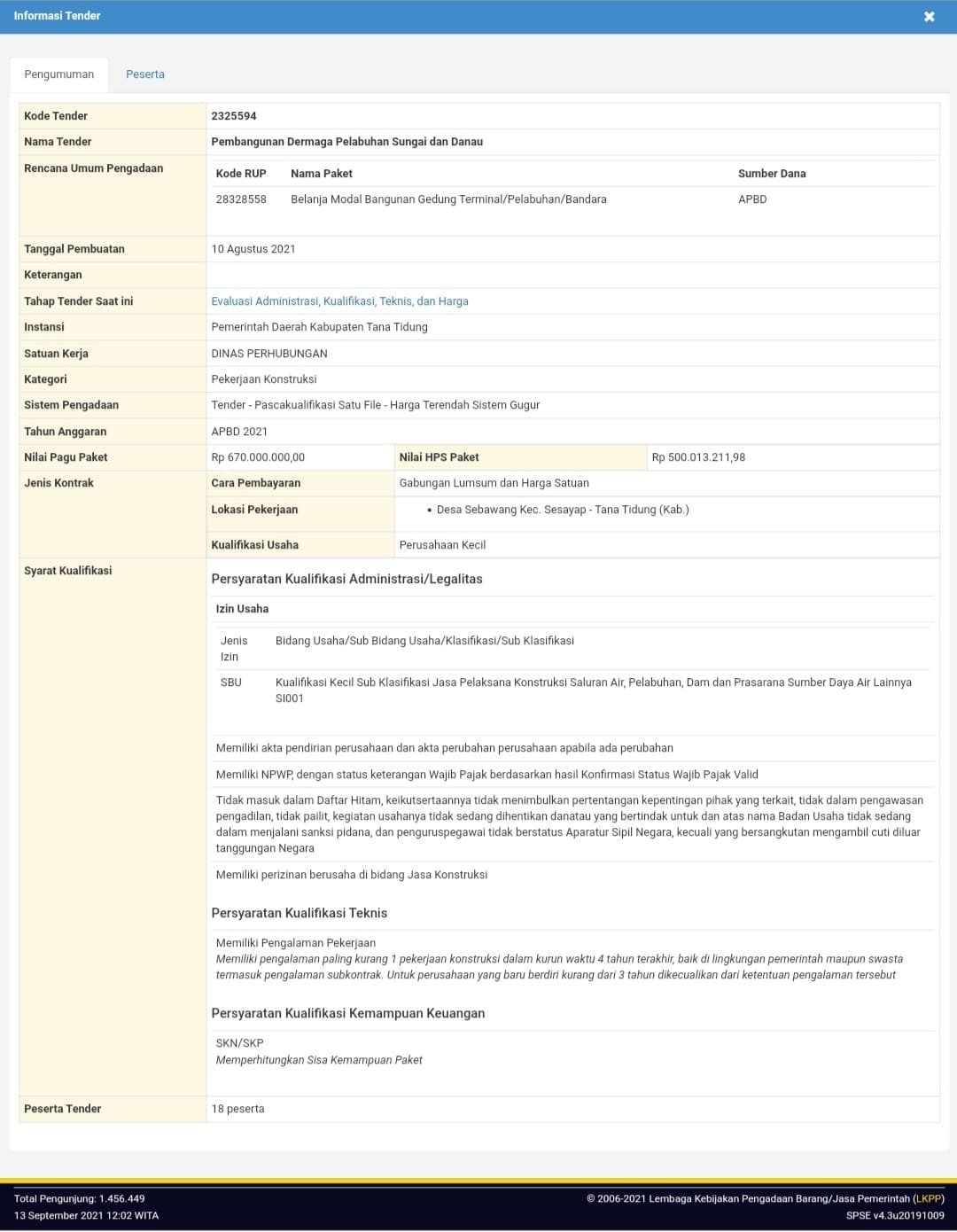 Rencana pembangunan dermaga ini telah masuk lelang pada sistem Layanan Pengadaan Secara Elektronik (LPSE) Kabupaten Tana Tidung (KTT). Berdasarkan pantauan di LPSE Tana Tidung, lelang tersebut, diikuti sebanyak 18 kontraktor dan belum ditentukan siapa pemenang lelangnya.