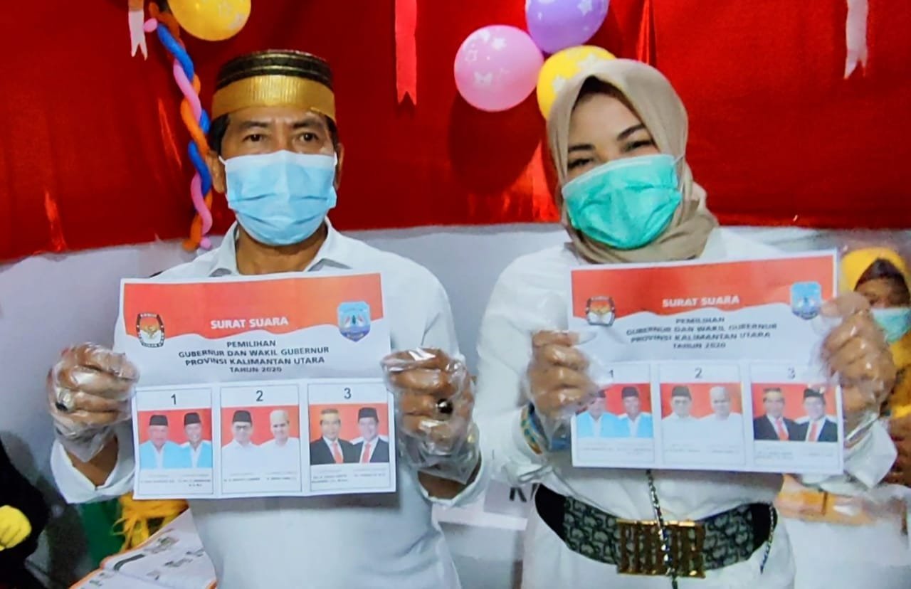 Cagub Kaltara nomor urut 03, Drs.H.Zainal Arifin Paliwang SH, M.Hum dan Istri saat memperlihatkan surat suara pilgub Kaltara. Diketahui Zainal dan Istri nyoblos di Karang Rejo, Kota Tarakan.