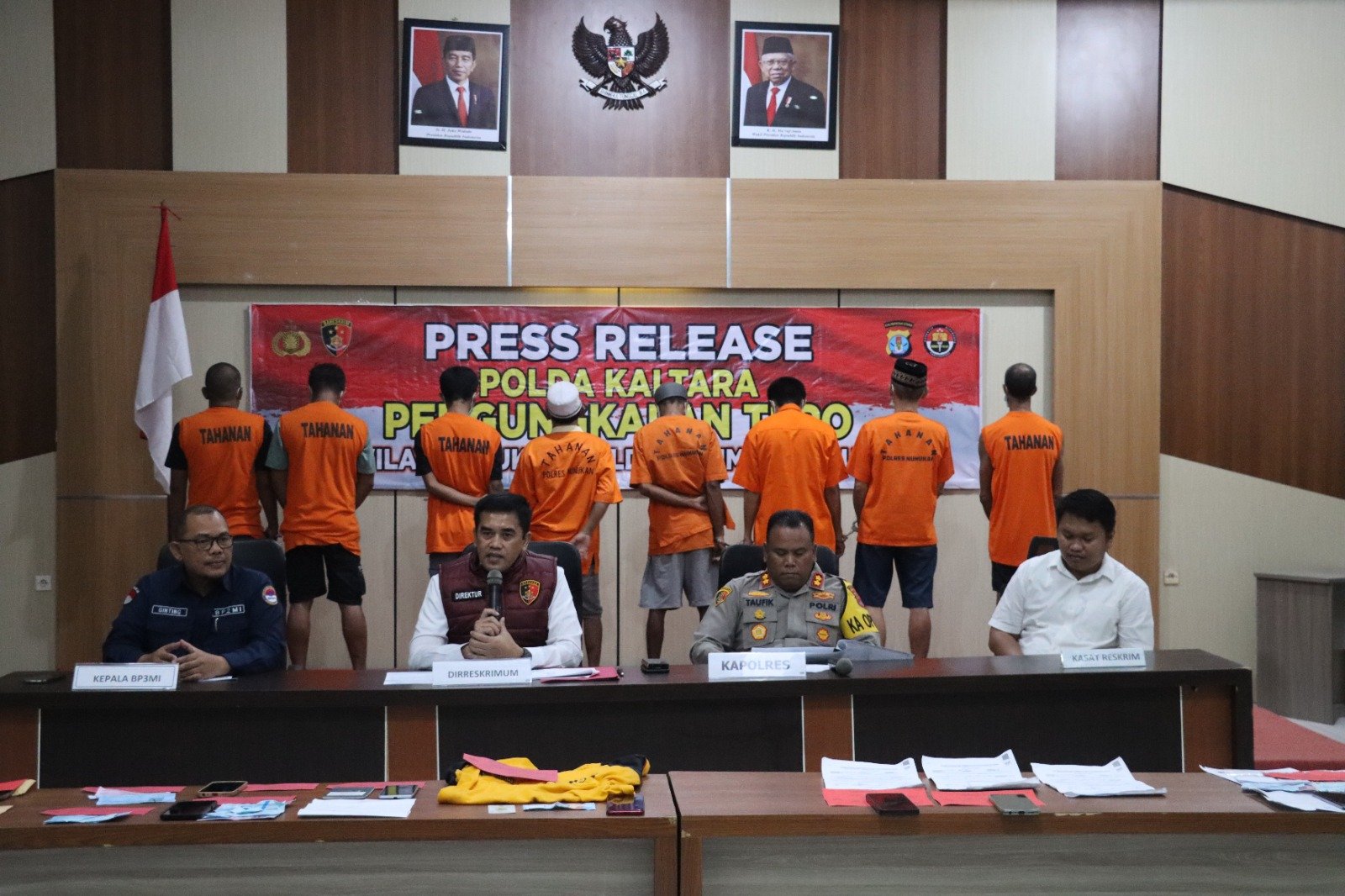 Direktur Ditreskrimum Polda Kaltara, Kombes Pol. Taufik Herdiansyah Zeinardi, dengan didampingi Kepala BP2MI Nunukan Kombes Pol. F. Jaya Ginting, Kapolres Nunukan AKBP Taufik Nurmandia dan Kasat Reskrim Polres Nunukan AKP Lusgi Simanungkalit melaksanakan Press release Pengungkapan Kasus Tindak Pidana Perdagangan Orang dan Tindak Pidana Perlindungan Pekerja Migran Indonesia selama Bulan Januari 2024 – April 2024 bertempat di Aula Sebatik Polres Nunukan.