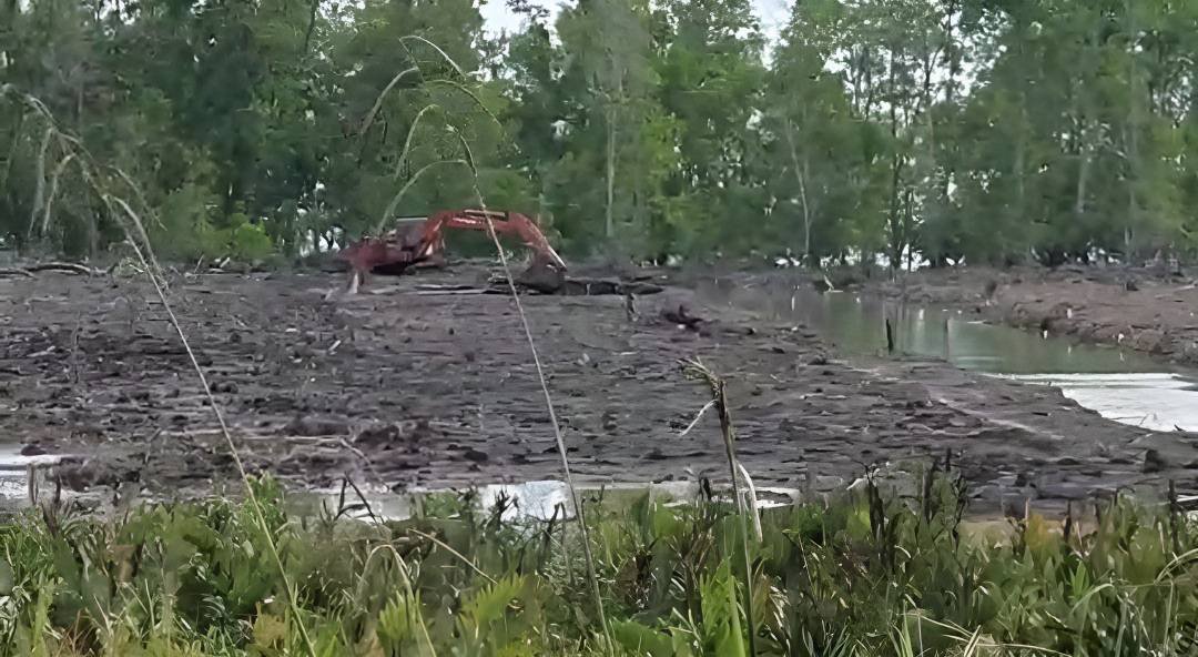 Salah satu lokasi kawasan hutan mangrove di Pulau Sebatik Kecamatan Sebatik Barat, Kabupaten Nunukan, Kalimantan Utara yang terjadi pembalakan menggunakan alat berat jenis excavator. Foto: ist