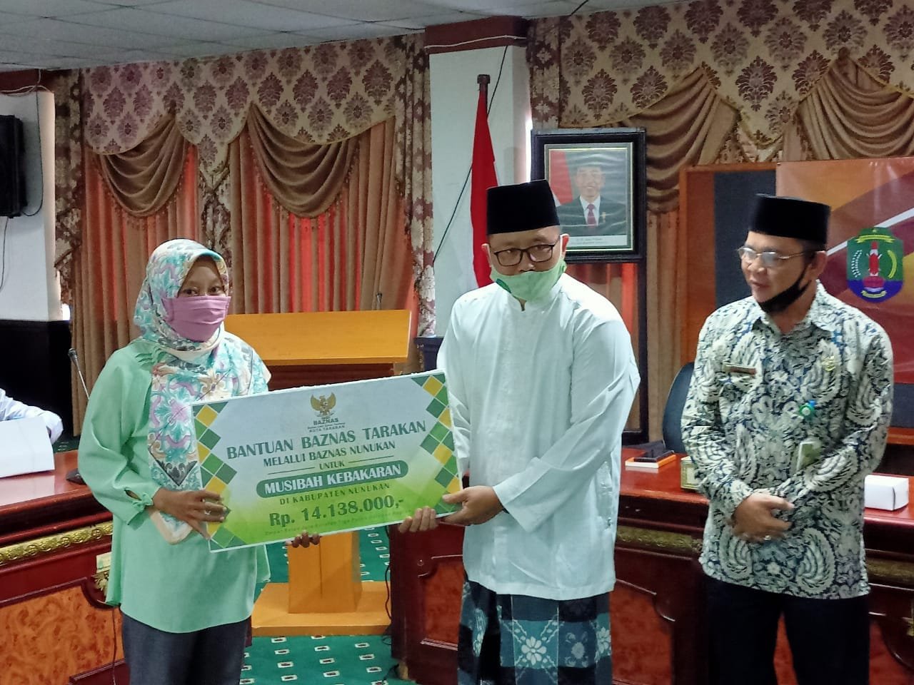 Acara gelar doa bersama juga dirangkai dengan penyerahan simbolis bantuan Baznas terkait musibah kebakaran, banjir sembakung dan gempa Sulbar yang diserahkan langsung Ustad Zahri Fadli selaku ketua Baznas Nunukan kepada Hj. Asmin Laura Hafid. Foto: Istimewa