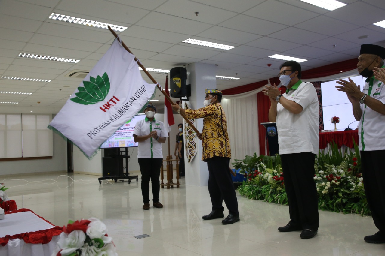 Penunjukan Gubernur Zainal sebagai Ketua DPD HKTI Kaltara tersebut ditandai dengan penyerahan bendera HKTI oleh Doddy Imron Cholis kepada Gubernur Zainal. (TR/dkispkaltara)