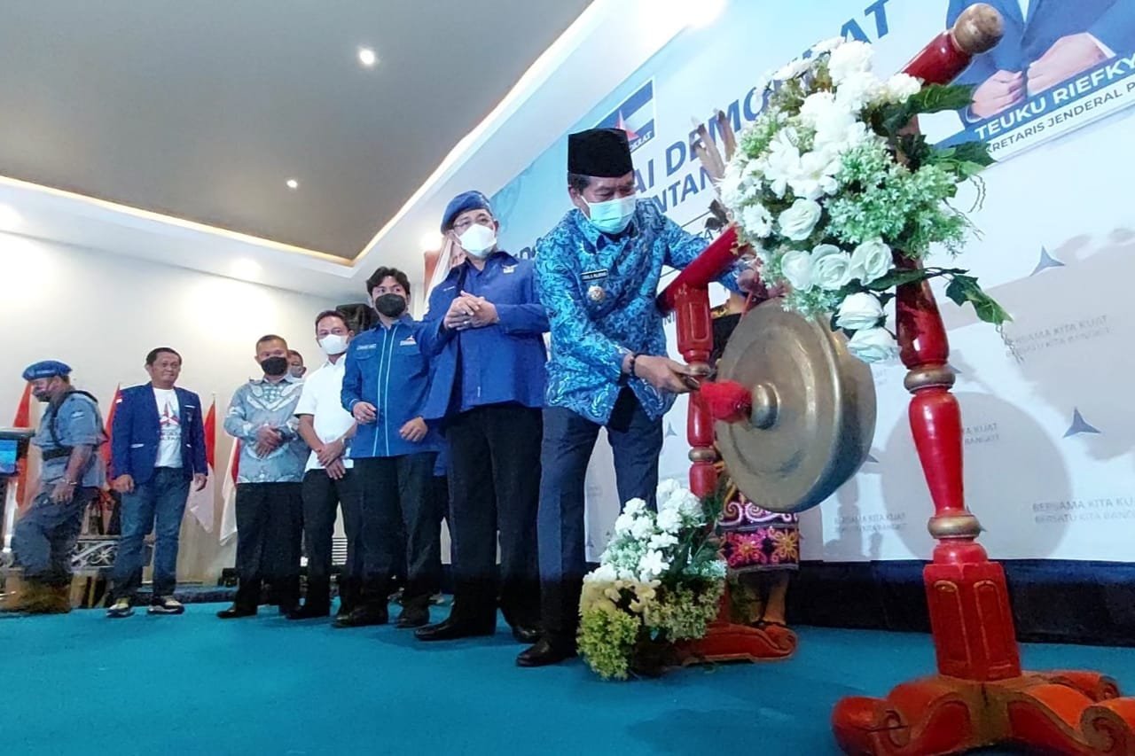 Gubernur Kaltara Drs H.Zainal A.Paliwang, SH, M.Hum didaulat membuka pelaksanaan Musyawarah Daerah (Musda) ke-II Dewan Pimpinan Daerah Partai Demokrat Tahun 2021 yang ditandai dengan pemukulan gong di Hotel Luminor, Tanjung Selor, Selasa (29/6/2021). Foto: Johan