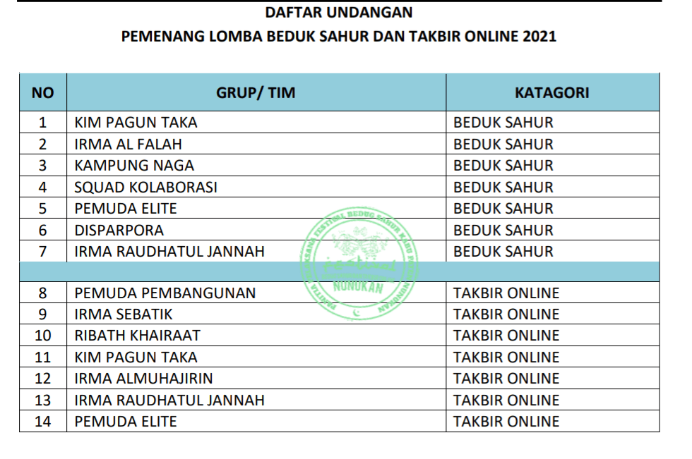 “Iya, pihak Pemkab meminta agar penerimaan hadiah bedug sahur dan takbir online di barengkan dengan kegiatan rutin pemda Nunukan yakni halal bihalal,” ucap Safaruddin selaku ketua panitia Festival Bedug Sahur dan Takbir Online Nunukan tahun 2021.