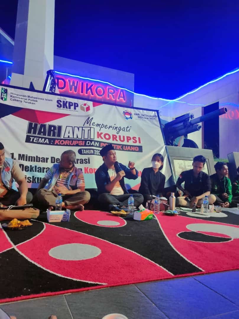 NUNUKAN, Kaltaraaktual.com– Himpunan Mahasiswa Islam (HMI) Komisariat Politeknik Negeri Nunukan (PNN) bersama Alumni Sekolah Kader Pengawas Partisipatif (SKPP) Bawaslu Nunukan Peringati hari anti korupsi sedunia di alun-alun kota Nunukan Tugu Dwikora, Kaltara, pada Kamis, (09/12/2021).