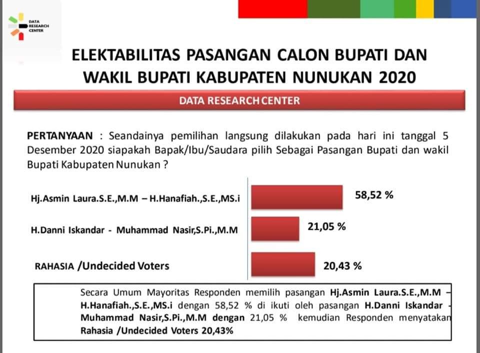 NUNUKAN, Kaltaraaktual.com– Hasil Survei yang dilakukan Riset Data Research Center (DRC) menunjukkan elektabilitas (keterpilihan) pasangan calon Bupati-Wakil Bupati Nunukan nomor urut 01 Hj Asmin Laura Hafid-H Hanafiah bertagline Amanah unggul dengan persentase 58,52 persen dibandingkan penantangnya H Danni Iskandar-H Muhammad Nasir bertagline Damai hanya 21,05 persen.