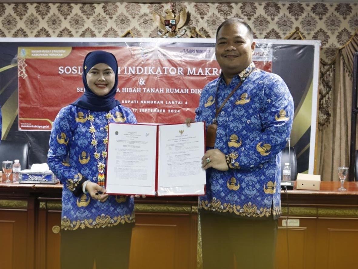 NUNUKAN, Kaltaraaktual.com- Badan Pusat Statistik (BPS) Kabupaten Nunukan menggelar kegiatan Sosialisasi Indikator Makro yang dirangkai dengan Serah Terima Hibah Tanah Rumah Kepala Dinas BPS Kabupaten Nunukan yang diserahkan langsung oleh Bupati Nunukan Asmin Laura Hafid di Lantai 4 Kantor Bupati Nunukan, Selasa (17/9/2024).