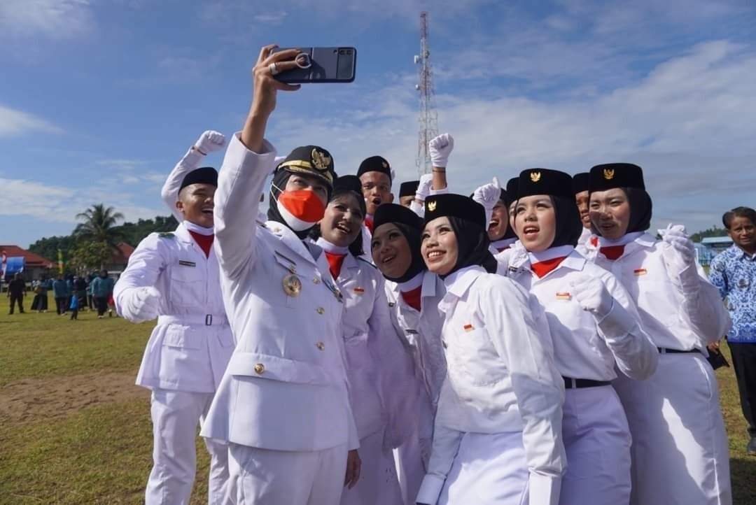 Usai Upacara Laura meninggalkan mimbar Upacara langsung ke tengah lapangan untuk sekedar mengajak seluruh peserta upacara ber-selfie ria dan meneriakkan “Dirgahayu Republik Indonesia, Jaya Jaya Jaya”. (prokompim)