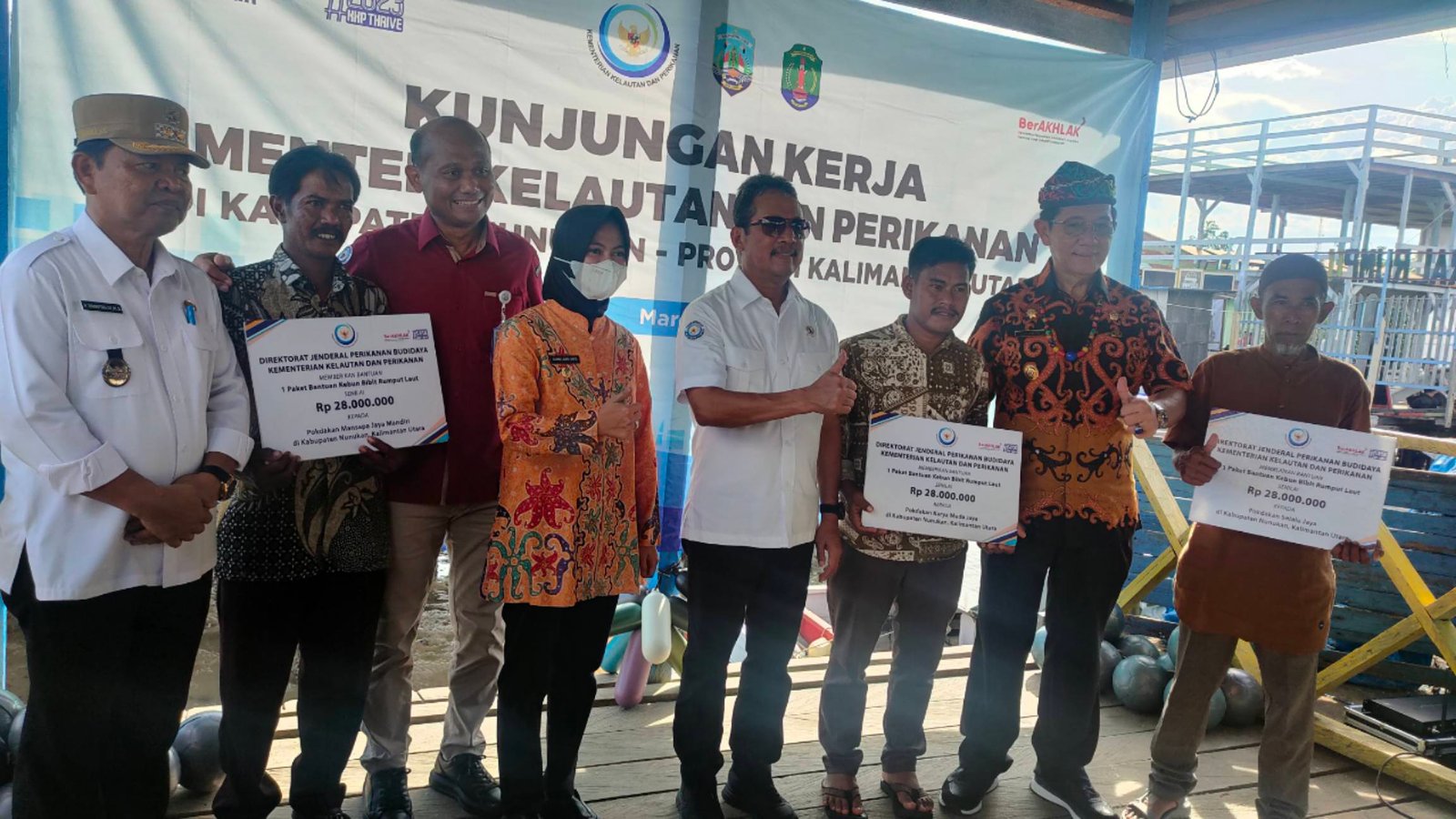 NUNUKAN, Kaltaraaktual.com– Bupati Nunukan Hj Asmin Laura Hafid bersama wakil Bupati Nunukan H Hanafiah menyambut kedatangan Menteri Kelautan dan Perikanan Republik Indonesia Sakti Wahyu Trenggono bersama rombongan yang melakukan kunjungan kerja panen rumput laut dan memberikan bantuan kebun bibit rumput laut kepada Pokdakan di Kabupaten Nunukan, Kalimantan Utara (Kaltara) tepatnya di Kampung Budidaya Rumput Laut Mamolo, Nunukan Selatan.