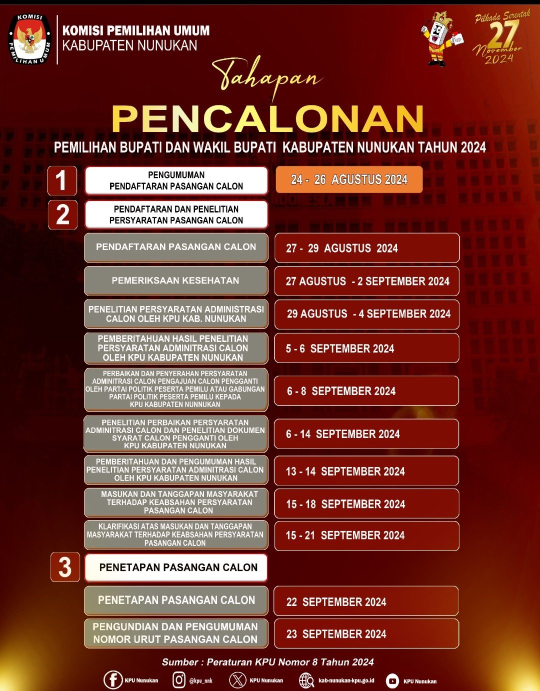 Sementara itu waktu pendaftaran dimulai 27-29 Agustus 2024 di Kantor KPU Nunukan, Jalan Briptu Muh Aldy, RT 5, Ujang Dewa, Kelurahan Nunukan Selatan.