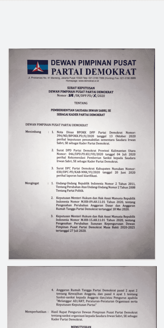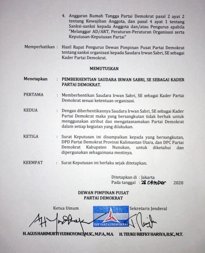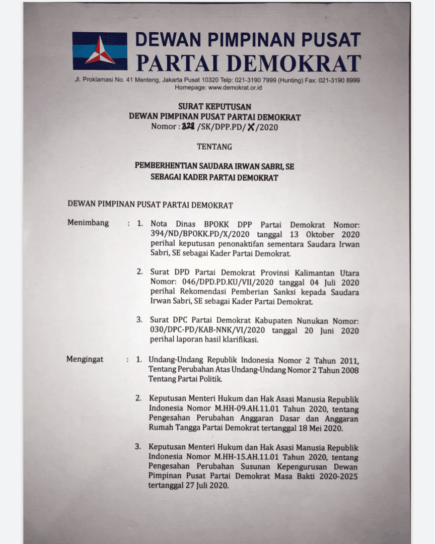 TARAKAN, Kaltaraaktual.com – Melalui Surat Keputusan Dewan Pimpinan Pusat (DPP) Partai Demokrat, H. Irwan Sabri, SE resmi diberhentikan dari kader Partai Demokrat, Rabu (28/10/2020).