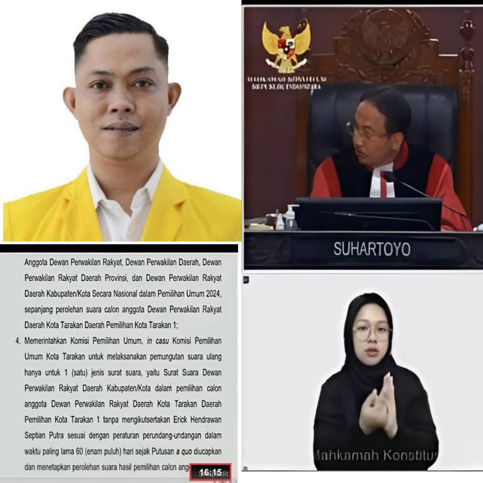 “Mengabulkan permohonan Pemohon untuk sebagian, menyatakan mendiskualifikasi Erick Hendrawan Septian Putra sebagai calon anggota Dewan Perwakilan Rakyat Daerah Kota Tarakan Daerah Pemilihan Kota Tarakan 1, memerintahkan Komisi Pemilihan Umum, in casu Komisi Pemilihan Umum Kota Tarakan untuk melaksanakan pemungutan suara ulang hanya untuk 1 (satu) jenis surat suara, yaitu Surat Suara Dewan Perwakilan Rakyat Daerah Kabupaten/Kota dalam pemilihan calon anggota Dewan Perwakilan Rakyat Daerah Kota Tarakan Daerah Pemilihan Kota Tarakan 1 tanpa mengikutsertakan Erick Hendrawan Septian Putra,” ungkap Ketua Majelis Hakim Suhartoyo dengan didampingi oleh 8 orang hakim konstitusi lainnya.