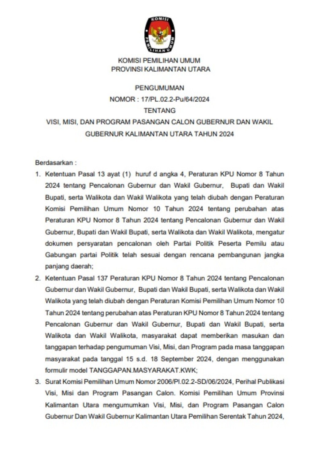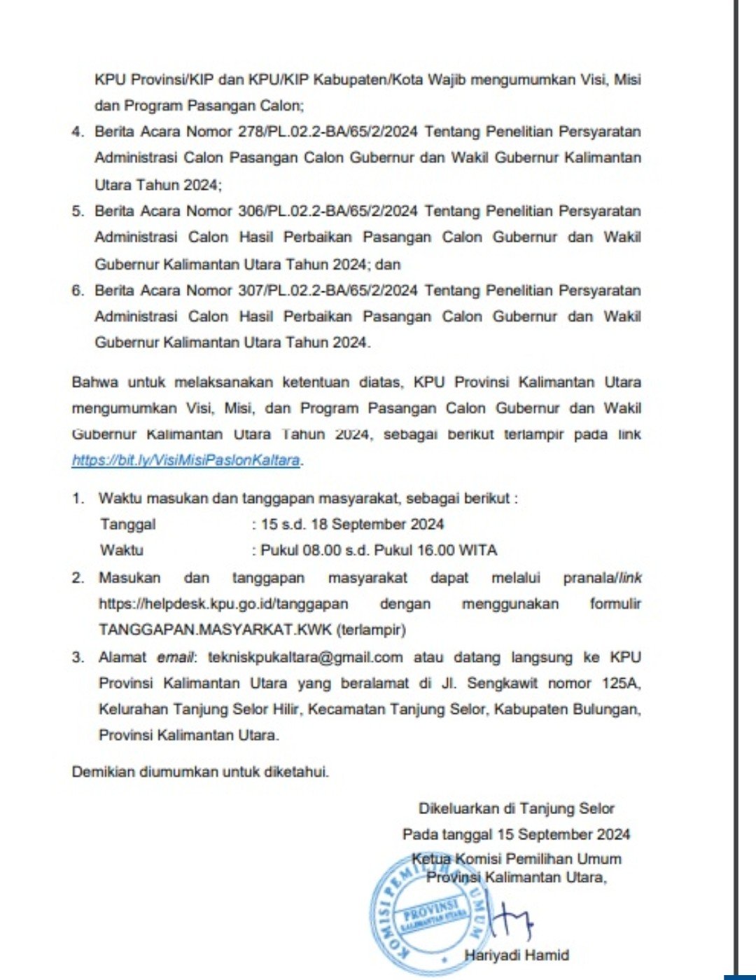 Dalam pengumuman KPU Kaltara Nomor: 17/PL02.2-Pu/64/2024 Ketua KPU Kaltara Hariyadi Hamid, dalam keterangan tertulisnya menyatakan, masyarakat bisa memberikan masukan dan tanggapannya secara online melalui maupun datang langsung ke kantor KPU Kaltara.