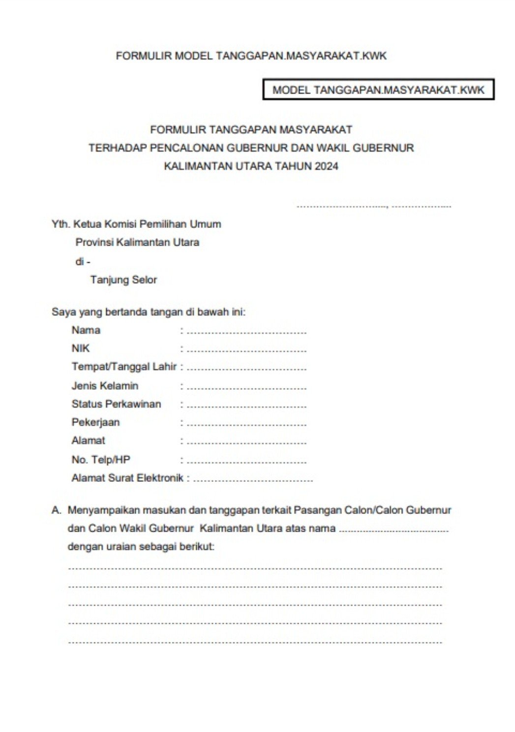 Untuk masukan dan tanggapan masyarakat dapat melihat melalui link https://helpdesk.kpu.go.id/tanggapan dengan menggunakan TANGGAPAN MASYARKAT.KWK lalu mengisi data (terlampir) di formulir.