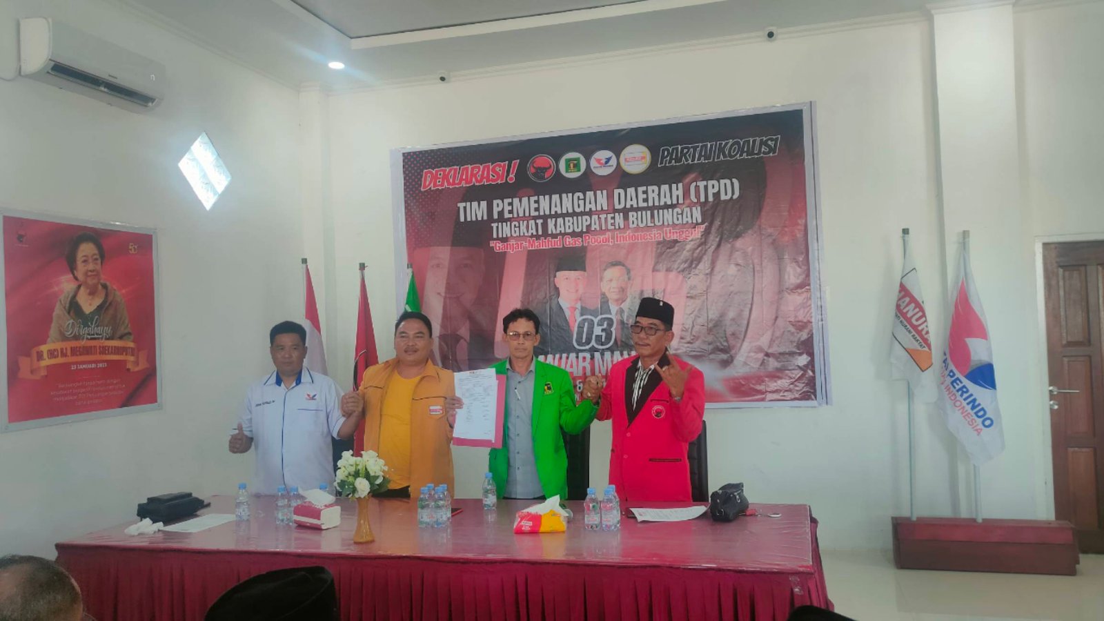 TANJUNG SELOR, Kaltaraaktual.com– Resmi, Tim Pemenangan Daerah (TPD) tingkat Kabupaten Bulungan bersama Dewan Pimpinan Cabang (DPC) PDI Perjuangan Kabupaten Bulungan dan partai pengusung lainnya menggelar deklarasi dukungan untuk pasangan Capres dan Cawapres nomor urut tiga Ganjar Pranowo-Mahfud MD.
