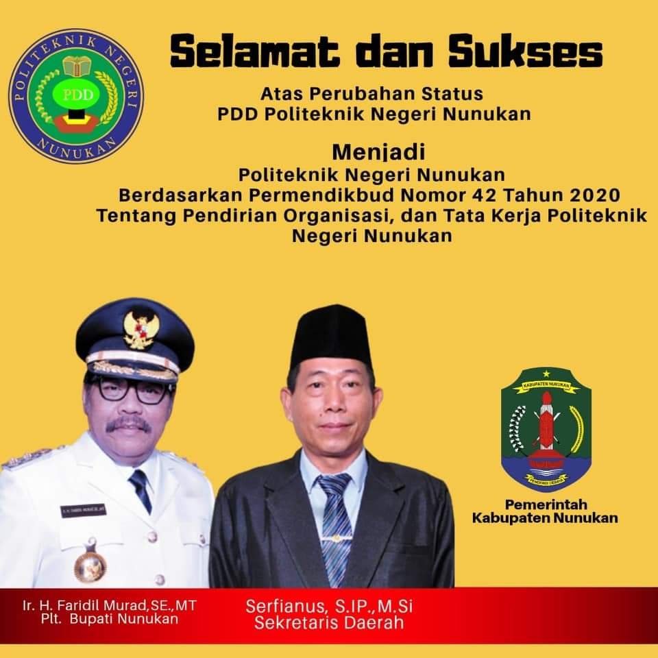 NUNUKAN, Kaltaraaktual.com – Harapan masyarakat dan Pemerintah Kabupaten Nunukan agar Politeknik Nunukan segera berstatus negeri akhirnya terwujud setelah Kementerian Pendidikan dan Kebudayaan Republik Indonesia (RI) mengeluarkan Peraturan Menteri Pendidikan dan Kebudayaan RI Nomor : 42 Tahun 2020 tanggal 24 September 2020 tentang Pendirian, Organisasi dan Tata Kerja Politeknik Negeri Nunukan.