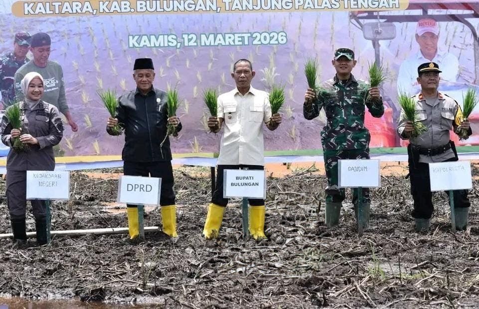 TANJUNG SELOR, KaltaraAktual.com- Syarwani bersama jajaran Pemerintah Kabupaten Bulungan, Forkopimda, serta para petani mengikuti Gerakan Tanam Serentak di lokasi Cetak Sawah Rakyat (CSR) Desa Salimbatu, Kecamatan Tanjung Palas Tengah, Kamis (12/03/26).