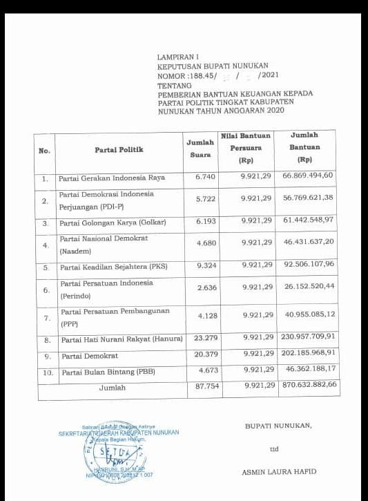 Wakil Bupati Nunukan H.Hanafiah mengatakan jumlah yang diterima parpol tergantung perolehan suara di DPRD Nunukan.