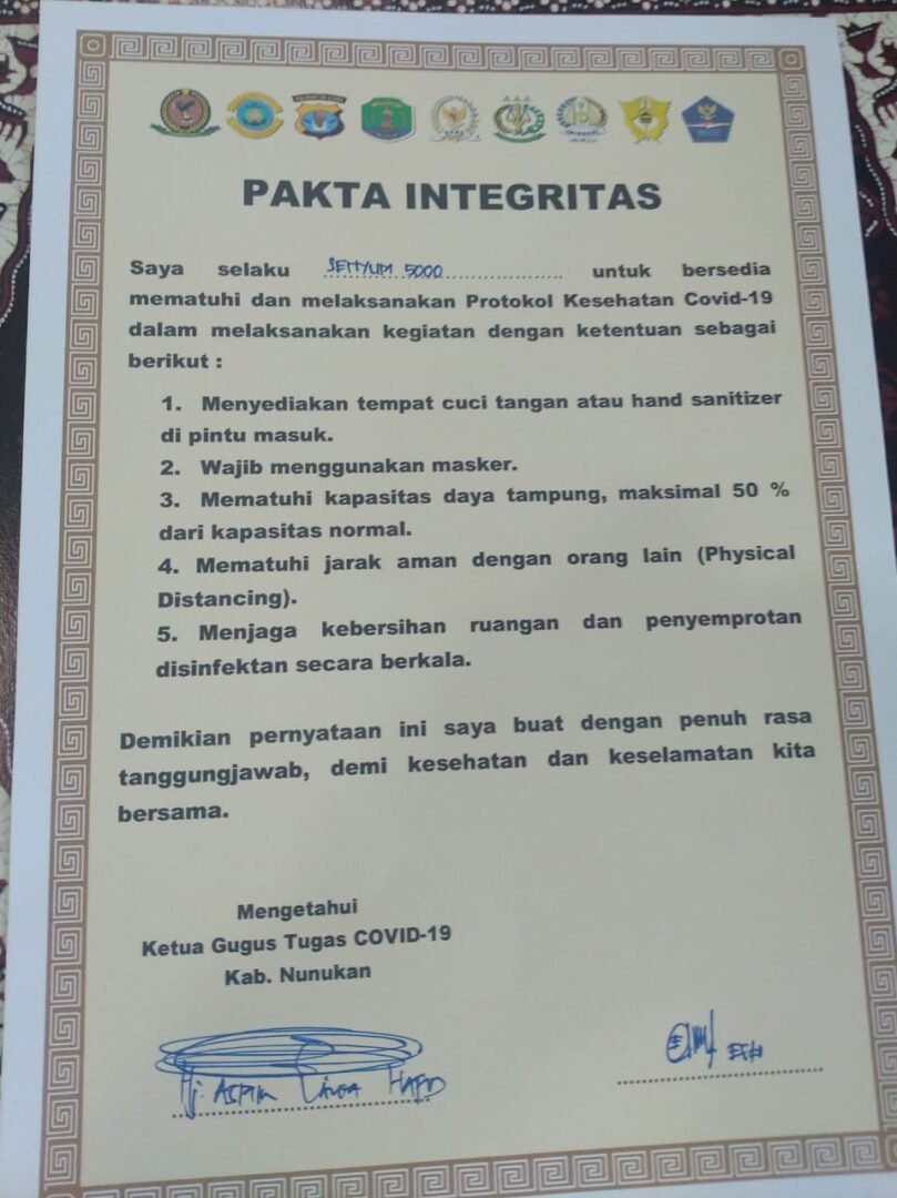 NUNUKAN – Bupati Nunukan Asmin Laura Hafid bersama unsur Pimpinan Tim Gugus Tugas usai apel di Makodim 0911 Nunukan melakukan sosialisasi prosedur new normal life. Sosialisasi menyasar usaha yang akan dibuka. Pemilik usaha diminta menandatangani fakta integritas untuk disiplin menerapkan menerapkan protokol kesehatan.