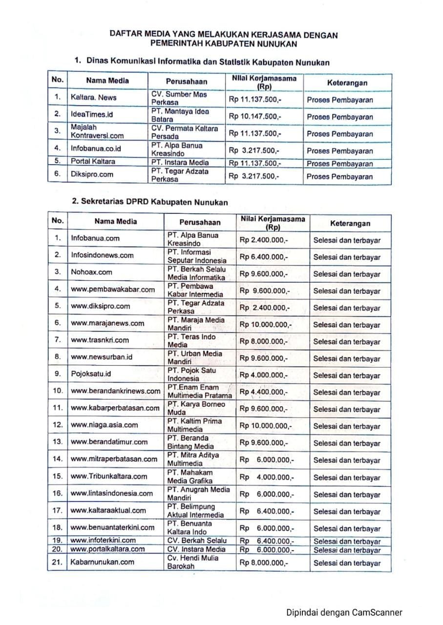 Ke-27 media online yang dibayar Pemkab Nunukan, namum kurang dari 10 media yang aktif meliput kegiatan Pemkab Nunukan dilapangan sampai saat ini. Hal lain yang menciderai kaidah jurnalistik ialah dengan media-media yang dibayar tetapi tidak pernah melakukan liputan kegiatan Pemkab Nunukan.