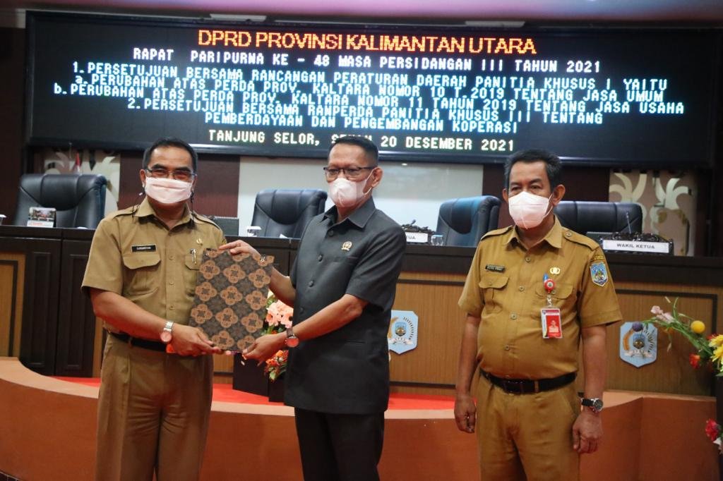 TANJUNG SELOR, Kaltaraaktual.com– Dewan Perwakilan Rakyat Daerah (DPRD) Provinsi Kalimantan Utara (Kaltara) mengadakan Rapat Paripurna Ke-48 dan Ke-49 Masa Persidangan III Tahun 2021 dengan agenda Persetujuan Bersama Rancangan Peraturan Daerah (Perda) Panitia Khusus (Pansus) I dan perubahan atas Rancangan Peraturan Daerah (Raperda) Panitia Khusus III tentang jasa usaha pemberdayaan dan pengembangan koperasi serta Rapat Paripurna Ke-49 dengan agenda Penyampaian Rekomendasi Pansus III Moda Transportasi Laut.