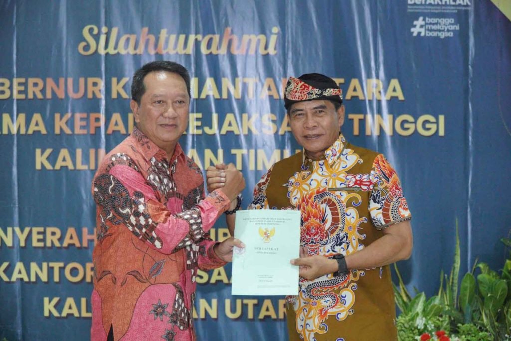 TANJUNG SELOR, Kaltaraaktual.com– Gubernur Kalimantan Utara (Kaltara), Drs. H. Zainal A. Paliwang, S.H., M.Hum menyerahkan Sertifikat Tanah untuk pembangunan Kantor Kejaksaan Tinggi Kaltara kepada Kepala Kejaksaan Tinggi (Kajati) Kalimantan Timur (Kaltim), Hari Setiyono, S.H., M.H.