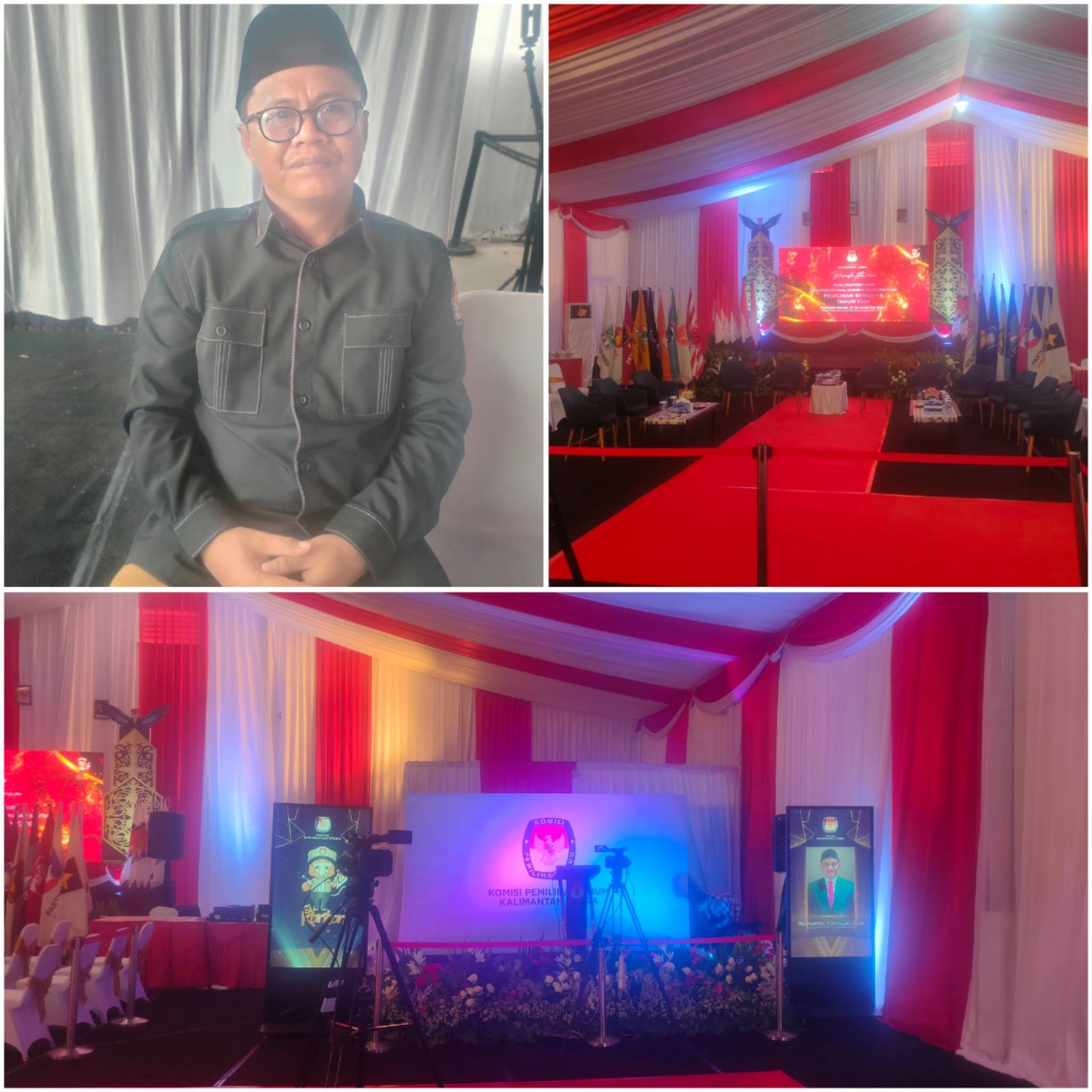 Di halaman Kantor KPU Kaltara sudah disediakan tempat duduk dan dekorasi terbilang indah ditambah menyedikan layar digital serta tempat vidiobooth 360 derajat, konsep dekorasi warna merah dan putih dengan pelayanan tuan rumah secara maksimal serta ada menyiapkan Vidiobooth 360 derajat.