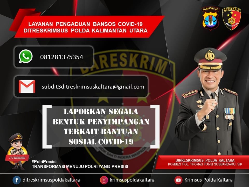 “Layanan pengaduan Bansos Covid-19 Ditreskrimsus Polda Kalimantan Utara ke nomor 081281375354 ini untuk memudahkan masyarakat yang terdampak Covid mengakses informasi dan menyampaikan pengaduan terkait penyaluran bantuan sosial dari pemerintah pada masa pandemi Covid-19,” ujar Kabid Humas Polda Kaltara, AKBP Budi Rachman, Rabu 27/01.