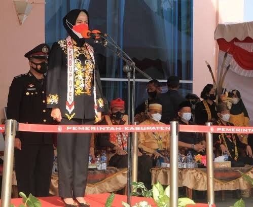 NUNUKAN, Kaltaraaktual.com– Mengenakan Pakaian Adat Tidung salah satu suku Tempatan di kabupaten Nunukan, Bupati Nunukan, Hj.Asmin Laura Hafid hadiri upacara peringatan Hari Lahir Pancasila Tahun 2022 secara Daring, bertempat di Lantai V Kantor Bupati Nunukan, Rabu (01/06/22).
