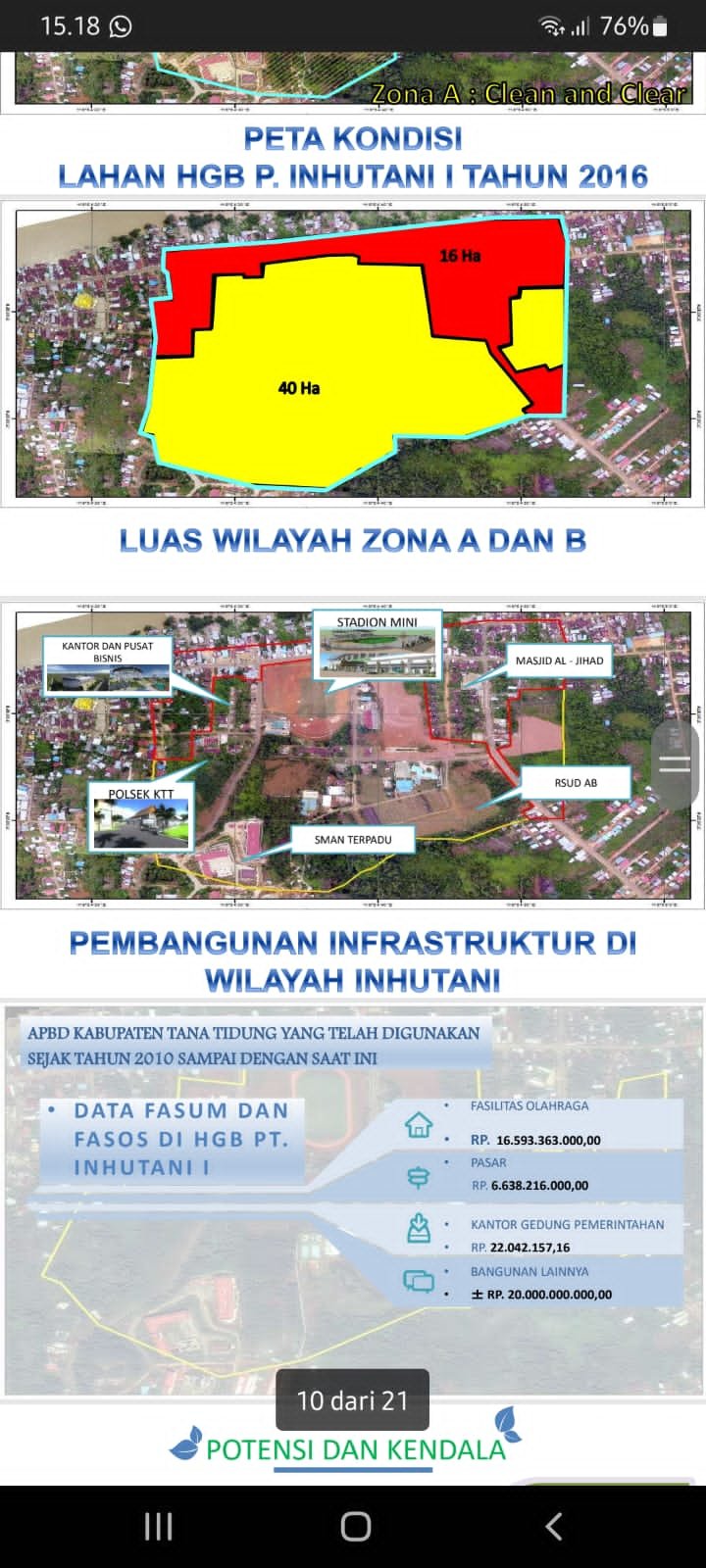 Arief kemudian menjelaskan, Pemda Tana Tidung telah melaksanakan pembangunan dengan menggunakan APBD Kabupaten Tana Tidung di atas Lahan Inhutani diantaranya adalah, Sekolah SMA Terpadu, Rumah Sakit, Gedung Dinas PU, Ruang Terbuka Hijau dan Stadion Mini, Fasilitas Umum lainnya. Dan dari total lahan inhutani 56 Ha tersebut, saat ini hampir sekitar 16 Ha telah dikuasai/okupasi dan digunakan oleh masyarakat.