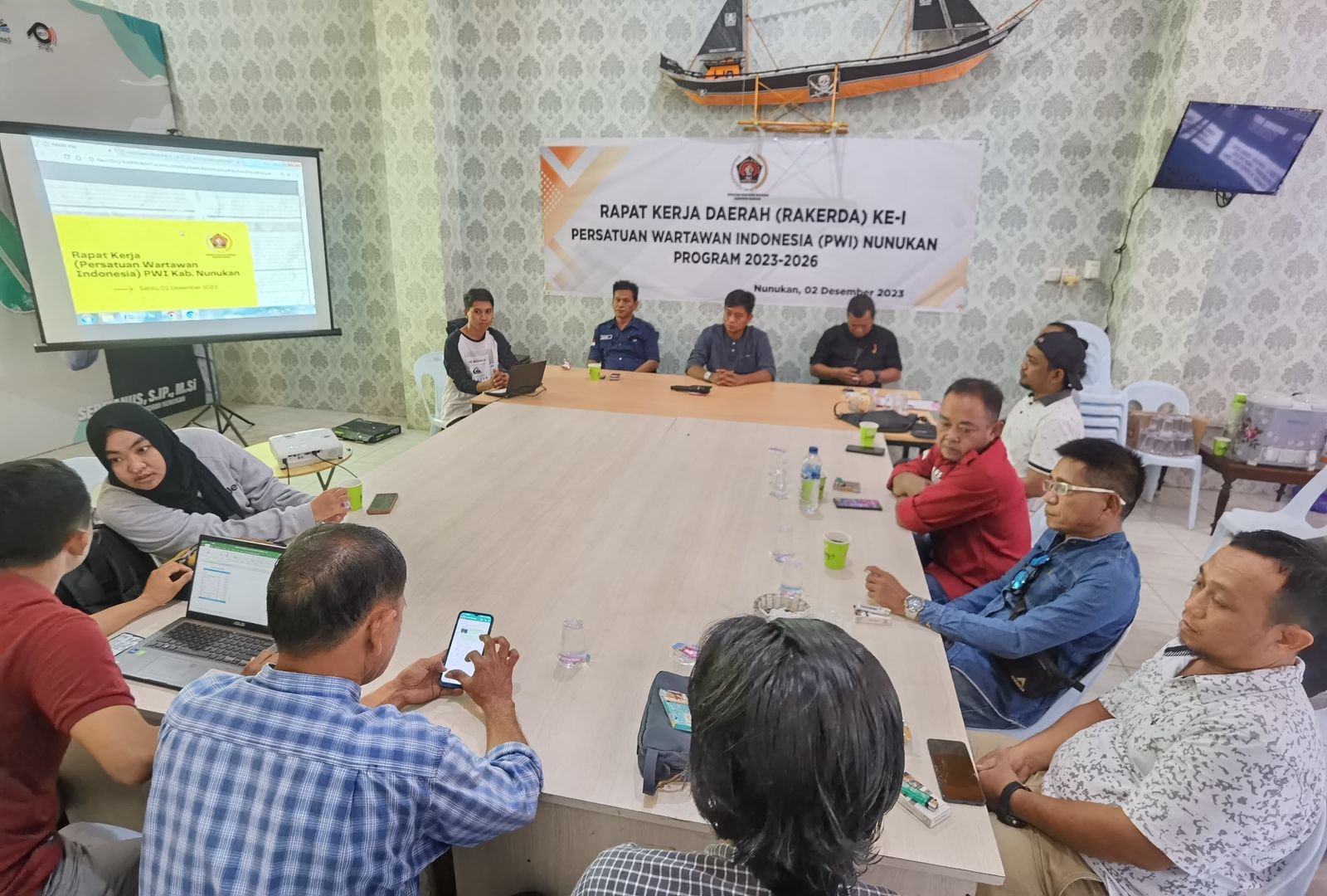 Rakerda ke-I PWI Nunukan dihadiri unsur pengurus dan dewan penasehat. Program yang disusun dan dibahas bersama, tertuang secara resmi dalam berita acara hasil rapat untuk kemudian disahkan menjadi program kerja periode 2023-2026. (pwinnkcenter)