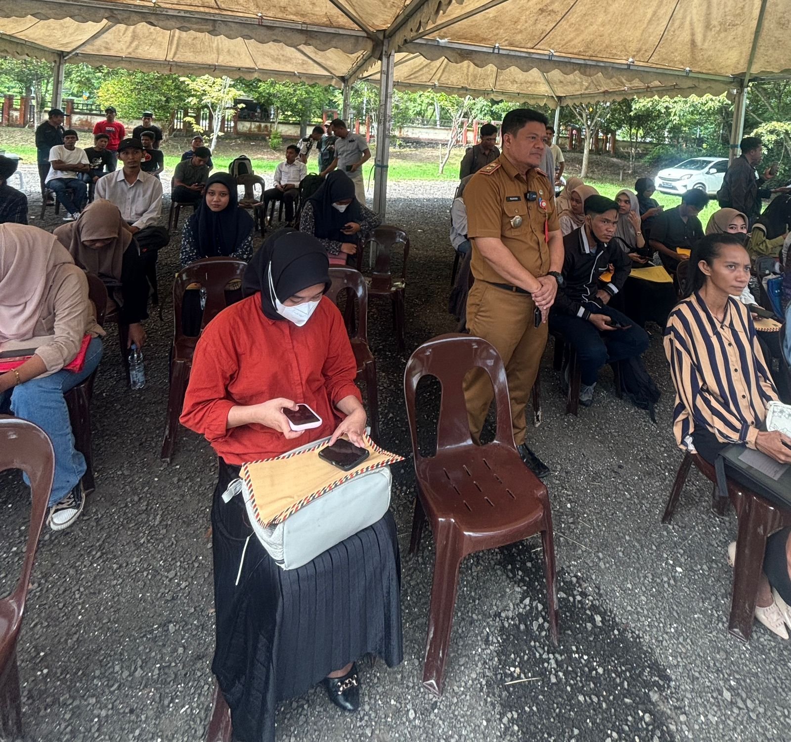 Sejak pembukaan acara Job fair di pagi hari, terlihat para pencari kerja mulai berdatangan sambil mengantri menunggu panggilan untuk masuk ke ruangan mengikuti wawancara langsung dari Perusahaan / Badan Usaha tempat lamaran kerja yang mereka tuju.