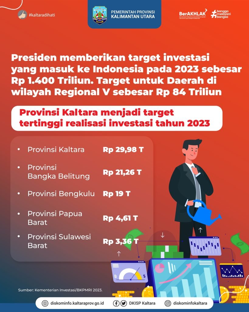 “Kaltara menjadi target tertinggi realisasi investasi tahun 2023. Yakni sebesar Rp 29,98 T. Disusul Provinsi Kepulauan Bangka Belitung Rp 21,26 T, Provinsi Bengkulu Rp 19 T, Provinsi Gorontalo Rp 5,48 T, Provinsi Papua Barat Rp 4,61 T, dan Provinsi Sulawesi Barat (Sulbar) sebesar Rp 3,36 T,” sebut Kepala DPMPTSP Kaltara, Ferry Ferdinand Bohoh.