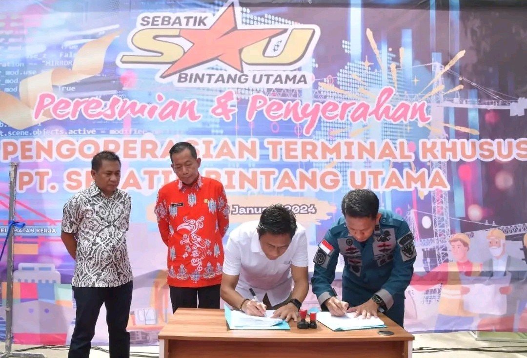 NUNUKAN, Kaltaraaktual.com– Sekretaris Daerah Kabupaten Nunukan Serfianus mewakili Bupati Nunukan meresmikan pengoperasian terminal khusus PT. Sebatik Bintang Utama yang ditandai dengan pengguntingan pita serta ikut menyaksikan penandatanganan kerjasama pemanfaatan perairan antara PT. Sebatik Bintang Utama dengan Kantor Unit Penyelenggaraan Pelabuhan Kelas III Sungai Nyamuk berdasarkan surat keputusan Menteri Hukum dan Hak Asasi Manusia Republik Indonesia Sesuai Keputusan Nomor AHU 0044419 AH. 01.01 Tahun 2016, yang dilaksanakan di Jalan Usman Harun RT. 001 Desa Sungai Panjang Sebatik Utara, Kamis 18 Januari 2024.