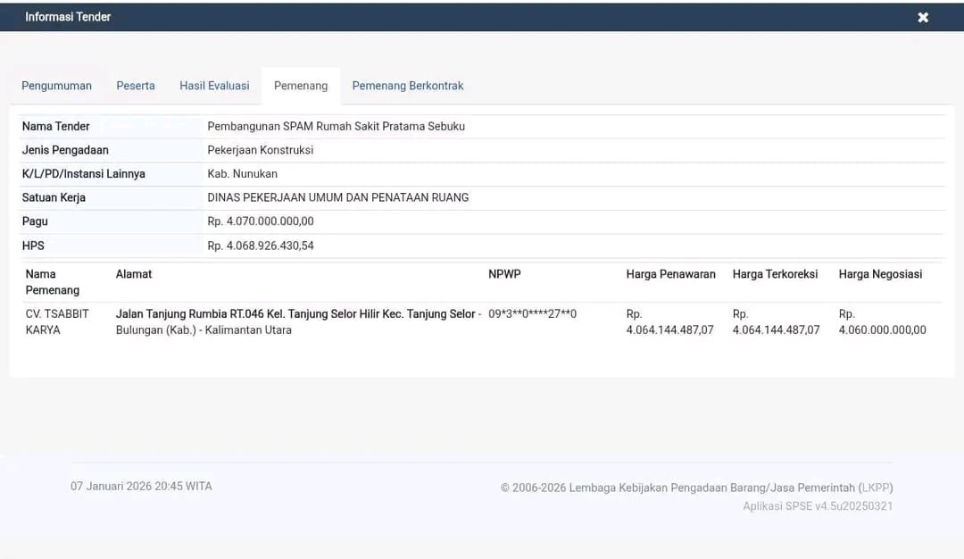 NUNUKAN, Kaltaraaktual.com- Di wilayah perbatasan seperti Nunukan, infrastruktur dasar bukan sekadar proyek. Ia adalah nadi pelayanan publik. Karena itu, ketika proyek Sistem Penyediaan Air Minum (SPAM) untuk Rumah Sakit Pratama di Kecamatan Sebuku, Kabupaten Nunukan menyisakan tanda tanya, yang dipertaruhkan bukan hanya angka dalam dokumen anggaran melainkan kepercayaan publik.