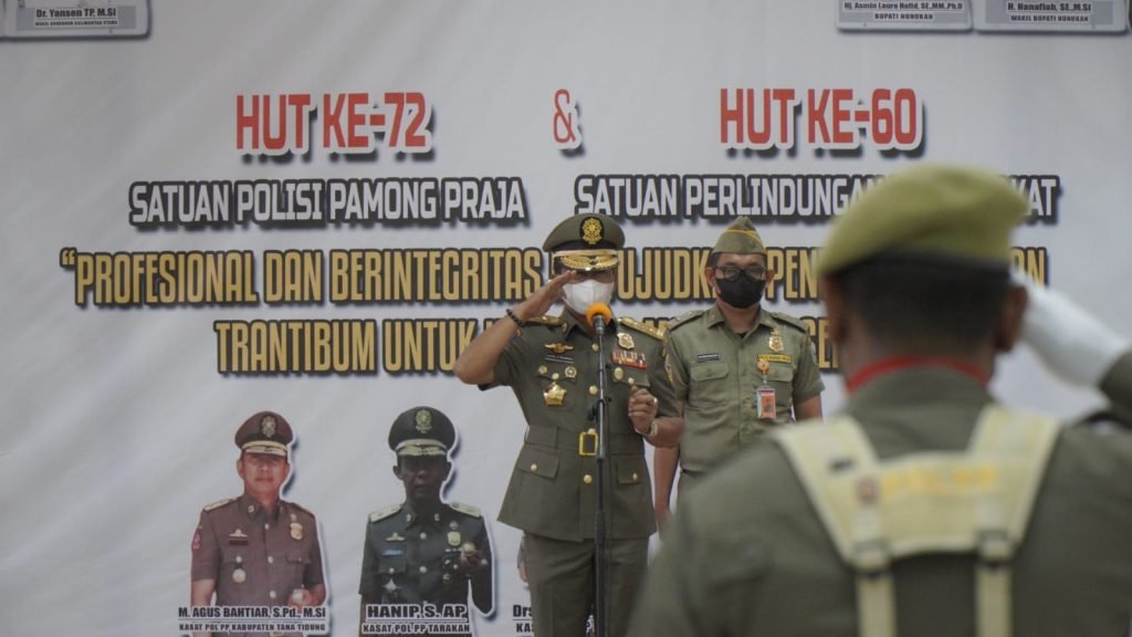 NUNUKAN, Kaltaraaktual.com– Gubernur Kalimantan Utara menjadi inspektur upacara peringatan Hari Ulang Tahun ke 72 Satuan Polisi Pamong Praja (Satpol PP) dan ke 60 Satuan Perlindungan Masyarakat, di Aula Kantor Bupati Nunukan, Jumat (11/3/2022).