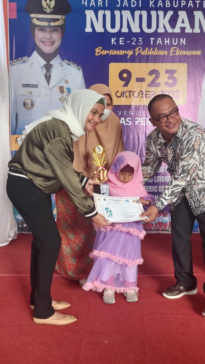 NUNUKAN, Kaltaraaktual.com, Bupati Nunukan Hj Asmin Laura Hafid menyerahkan piala hadiah lomba kepada kategori tari kreatif tingkat, busana dari bahan bekas jenjang, lomba bercerita juga dari jenjang PAUD, SD, SMP dan SMA sederajat, pada Jumat (14/10/22).