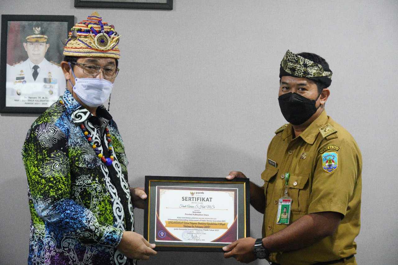 TANJUNG SELOR, Kaltaraaktual.com– Wakil Gubernur (Wagub) Kalimantan Utara (Kaltara) Yansen TP menghadiri pemberian Penghargaan Top Inovasi Pelayanan Publik Tahun 2021 yang diselenggarakan oleh Kementerian Pendayagunaan Aparatur Negara dan Reformasi Birokrasi (Kemenpan-RB) secara virtual, di Ruang Rapat lantai 1 Kantor Gubernur, Selasa (9/11).