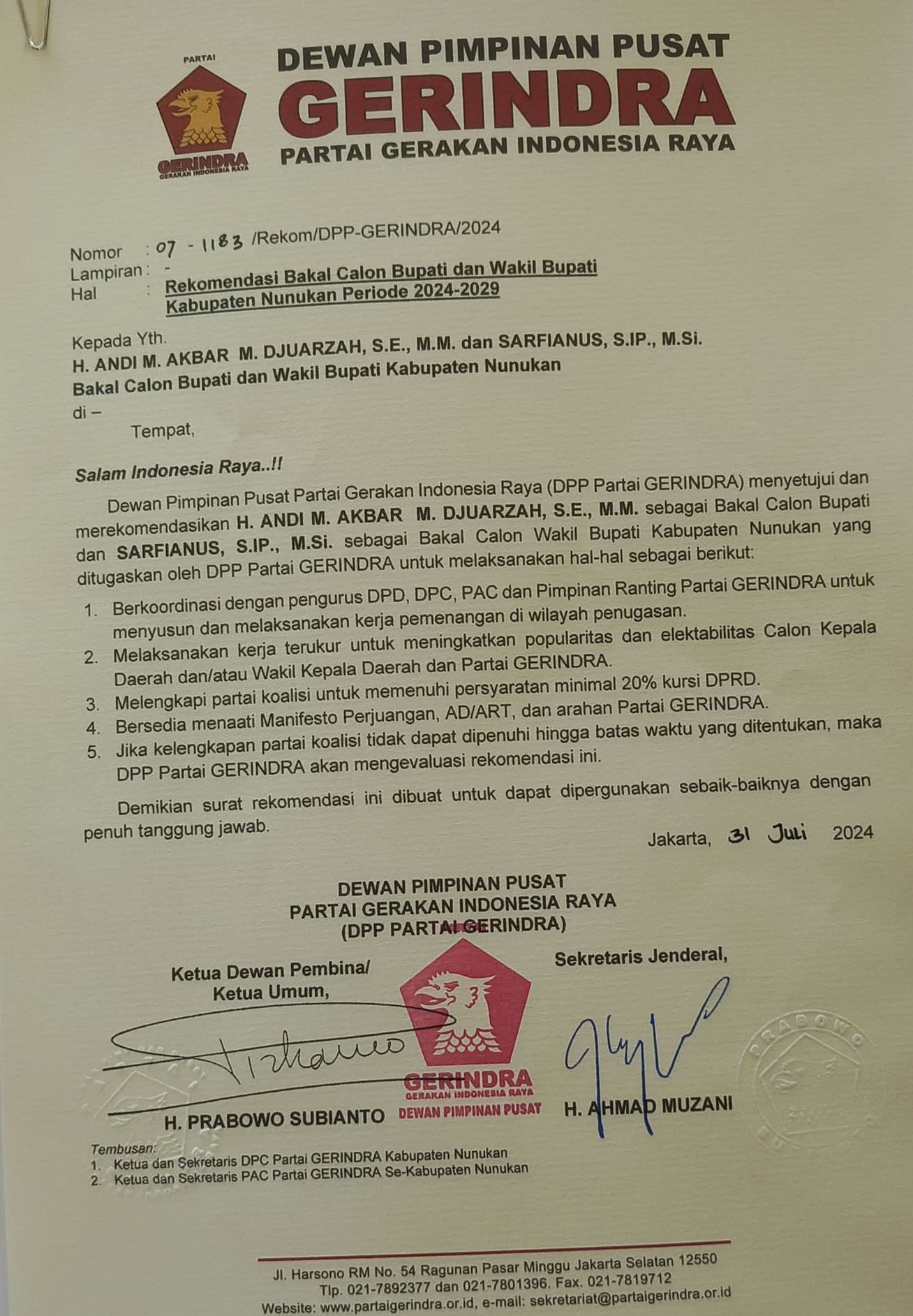 Ketua Umum Partai Gerindra, Prabowo Subianto, bersama dengan Sekretaris Jenderal, Ahmad Muzani, menandatangani surat rekomendasi yang mengesahkan pencalonan Andi M Akbar Djuarzah. Keputusan ini menegaskan komitmen Partai Gerindra dalam menghadirkan sosok pemimpin yang dinilai mampu membawa perubahan positif bagi Kabupaten Nunukan.
