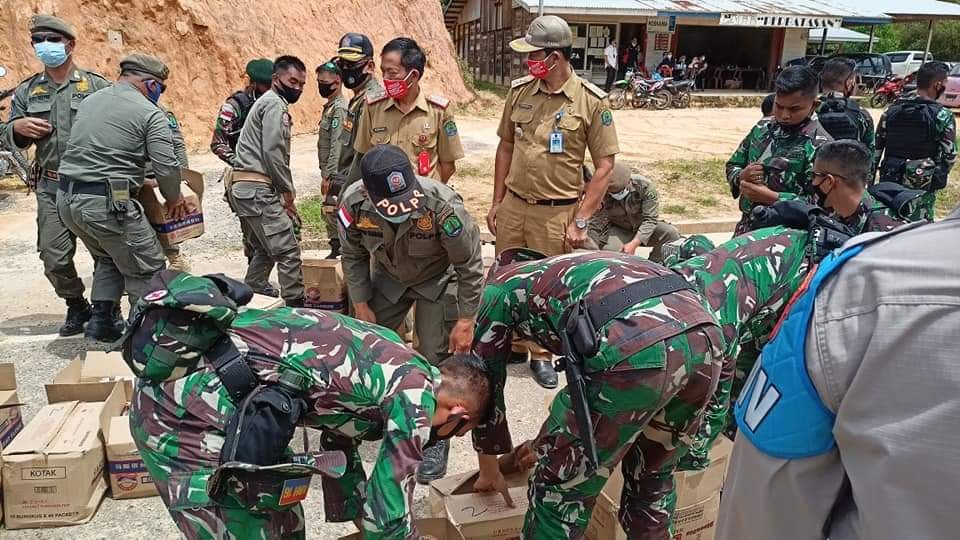Setiba di Pos Pemeriksaan Satgas Pamtas di Long Midang, petugas satgas Pamtas RI-Malaysia dari Batalyon Arhanud 16/SBC melakukan pemeriksaan pada barang yang masuk untuk mengantisipasi adanya barang ilegal. Dan sebelum dibawa ke Pa’ Api sebagai titik kumpul barang sebelum diserah terimakan, barang terlebih dahulu dilakukan desinfeksi sebagai langkah tetap protokol kesehatan.