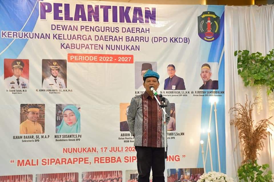 Pada pelantikan KKDB di Kabupaten Nunukan ini mengusung tema ‘Mali Siparappe, Rebba Sipatokkong’. Acara di awali dengan tarian dari anak anak kelahiran Barru yang memakai pakai Bodo’ atau pakaian adat dengan melakukan tarian Padduppa atau biasa disebut dengan tari pembukaan, lalu dilanjutkan dengan persembahan paduan suara Lagu Indonesia Raya dan mars KKDB kemudian dilanjutkan pembacaan ayat suci Al Quran.