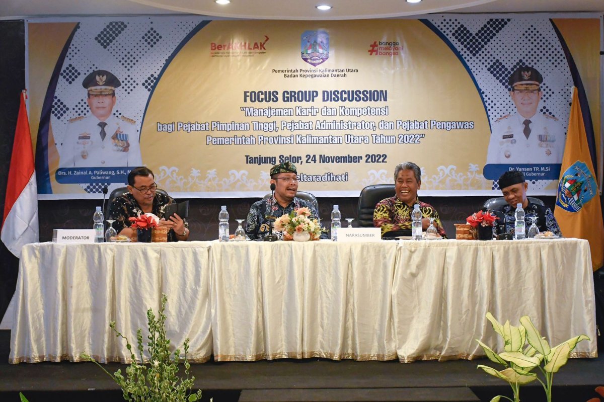TANJUNG SELOR, Kaltaraaktual.com– Mewakil Gubernur Kalimantan Utara (Kaltara) Drs. H. Zainal A Paliwang SH., M.Hum., Asisten bidang Administrasi Umum Setprov Kaltara, Pollymaart Sijabat, SKM.,M.AP secara resmi membuka kegiatan Focus Group Discussion (FGD) Perumusan Manajemen Karir dan Kompetensi bagi Aparatur Sipil Negara (ASN) di lingkungan Pemerintah Provinsi (Pemprov) Kaltara Tahun 2022 di Ruang Pertemuan, Hotel Crown, Tanjung Selor, Kamis (24/11/22).